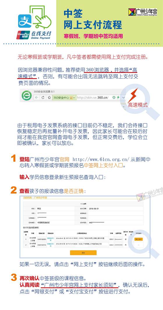 3.网上支付成功后一定要等待页面跳转回少年宫的注册页面,把开课日期、上课时间、地点等信息记录或打印出来,以免错过上课时间;