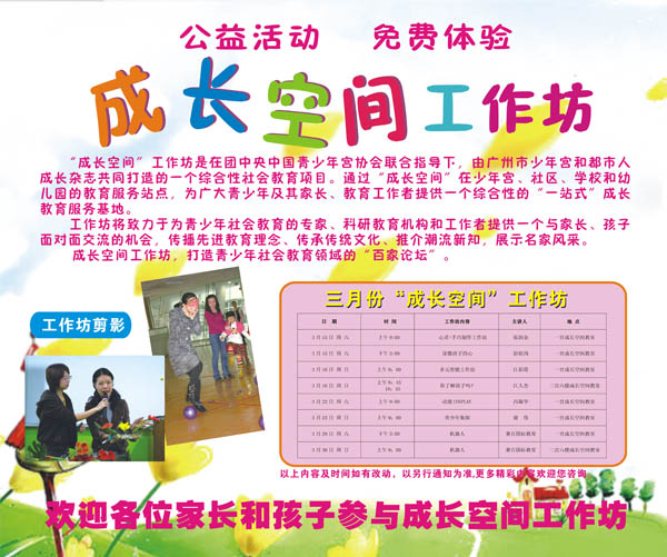 “成长空间”工作坊是在团中央中国青少年宫协会联合指导下,由广州市少年宫和都市人成长杂志共同打造的一个综合性社会教育项目。通过“成长空间”在少年宫、社区、学校和幼儿园的教育服务站点,为广大青少年及其家长、教育工作者提供一个综合性的“一站式”成长教育服务基地。