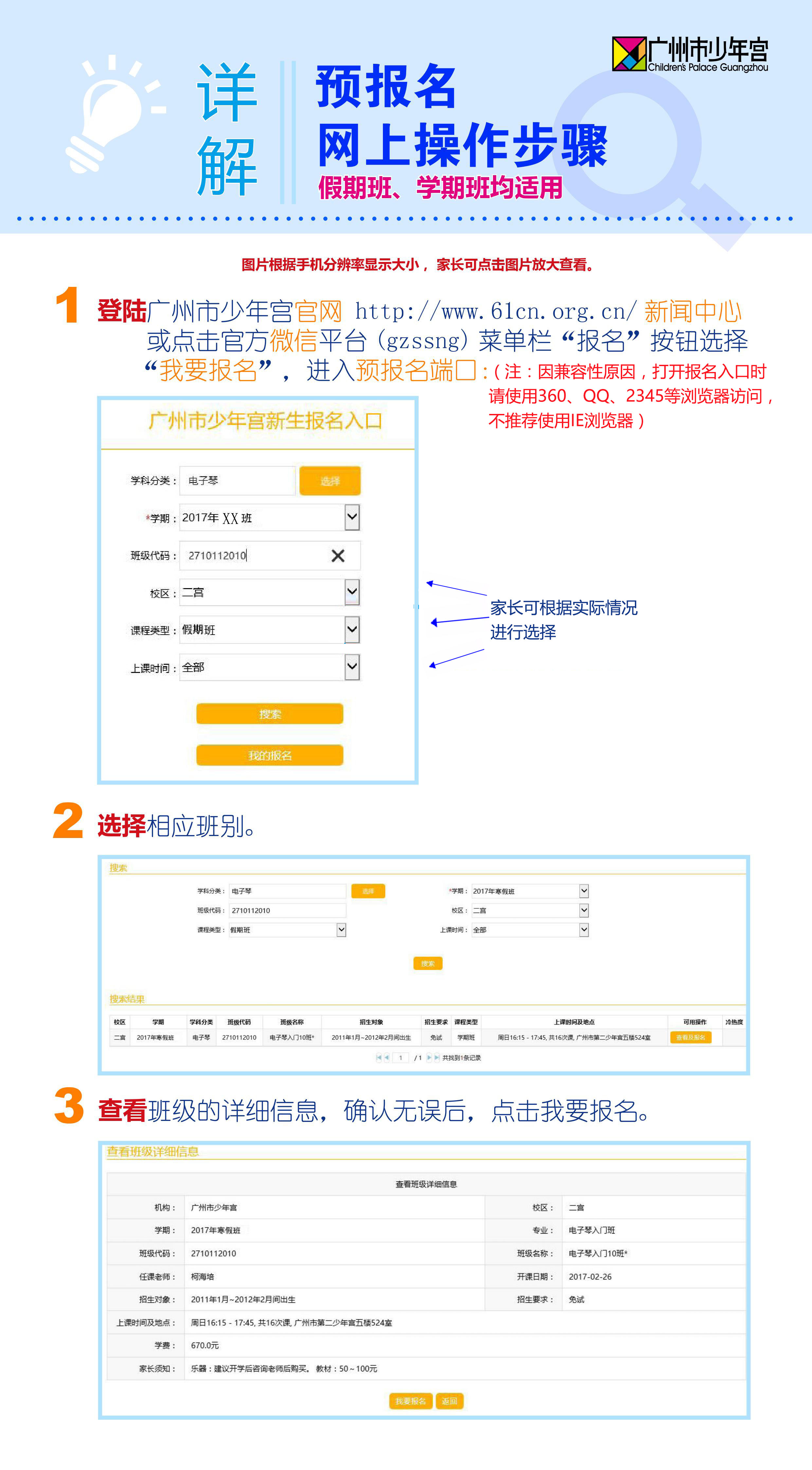 ●关注广州市少年宫官方微信(微信服务号:gzssng ),在手机上直接预报名;