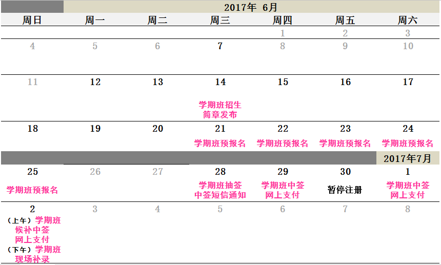 广州市少年宫2017年第二学期学期班预报名抽签工作已经完成,本宫课程的中签学员家长请在6月29日(周四)8:30-16:00或7月1日(周六)8:30-16:00,登陆广州市少年宫官网,在“新闻中心”栏目点击2017年第二学期学期班预报名中签网上支付入口进行支付(6月30日因月底财务结算原因,暂停支付一天)。各社区少年宫的中签学员家长或60岁以上不具备网上支付条件的中签学员家长,请于7月1日(周六)上午8:30-12:00,下午14:00-16:00前往中签课程所在社区少年宫或少年宫本宫现场缴费注册。
