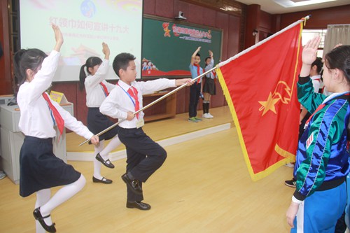 为更好的帮助少年儿童感知新时代,深入学习党的十九大精神,帮助广大少先队员牢记习近平总书记的教导,努力成长为担当民族复兴大任的时代新人,2018年4月18日,广州市少先队理事会和番禺市桥实验小学的师生近200人参加了“红领巾如何宣讲十九大——红领巾议事堂走进番禺市桥实验小学”活动。
