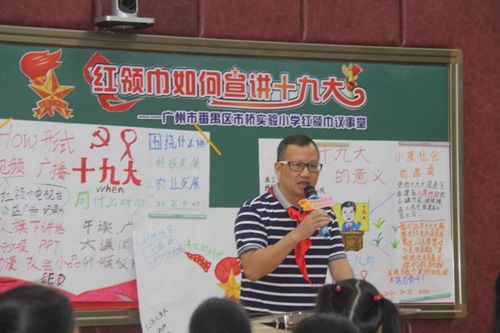 活动最后,番禺区市桥实验小学党支部书记汤志航书记点评时说到,少理事和少先队员代表的表现让人感到耳目一新,只能说“厉害了,新时代的少先队员!”。他对本次活动大家通过多渠道、多形式了解十九大的精神表示肯定,并鼓励在场所有少先队员从小听党话,深知作为少先队员身上的重任,从小立志,长大为国家建设添砖加瓦,为祖国的富强昌盛而努力奋斗。