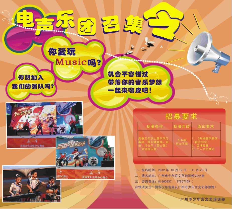 广州市少年宫电声乐团为提高乐团的整体水平,现定于11月份中旬再次举办乐团成员的公开招募活动,届时,少年宫的精英学员将云集一堂,为成为电声乐团的新生力量而进行了一场精彩的较量。如果你是音乐的爱好者,如果你想成为我们乐团的精英成员,赶快来报名参与吧!