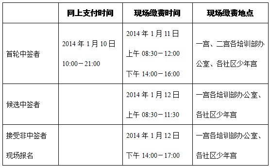 最后请家长们注意,1月8日抽签结束后,我们将在1月9日通过短信陆续下发抽签结果。因通信原因没能收到短信的家长,也可通过登陆少年宫官网www.www.adea-bj.com查询。中签家长可在1月10日通过网上支付完成学位的注册(目前仅接受一宫、二宫课程),或者在1月11日亲临各少年宫现场注册。没能中签但获得候选顺序号的家长,尤其是候选号比较靠前的,请密切留意1月11日当晚的候选结果短信。当报读的课程出现学位剩余时,我们将根据剩余量向相应靠前候选号的家长发送候选中签短信(家长也可在当晚通过官网查询候选结果),请家长根据短信内容在1月12日上午亲临各少年宫现场报读。再次提醒,没能在首轮中签或候选中签的家长,均请不要在11日当晚在少年宫现场连夜排队,因为学位是优先让中签学员报读的,只有在首轮中签及候选中签学员均放弃学位的情况下,所有的剩余学位才会在1月12日中午重新对外发布,敬请留意。