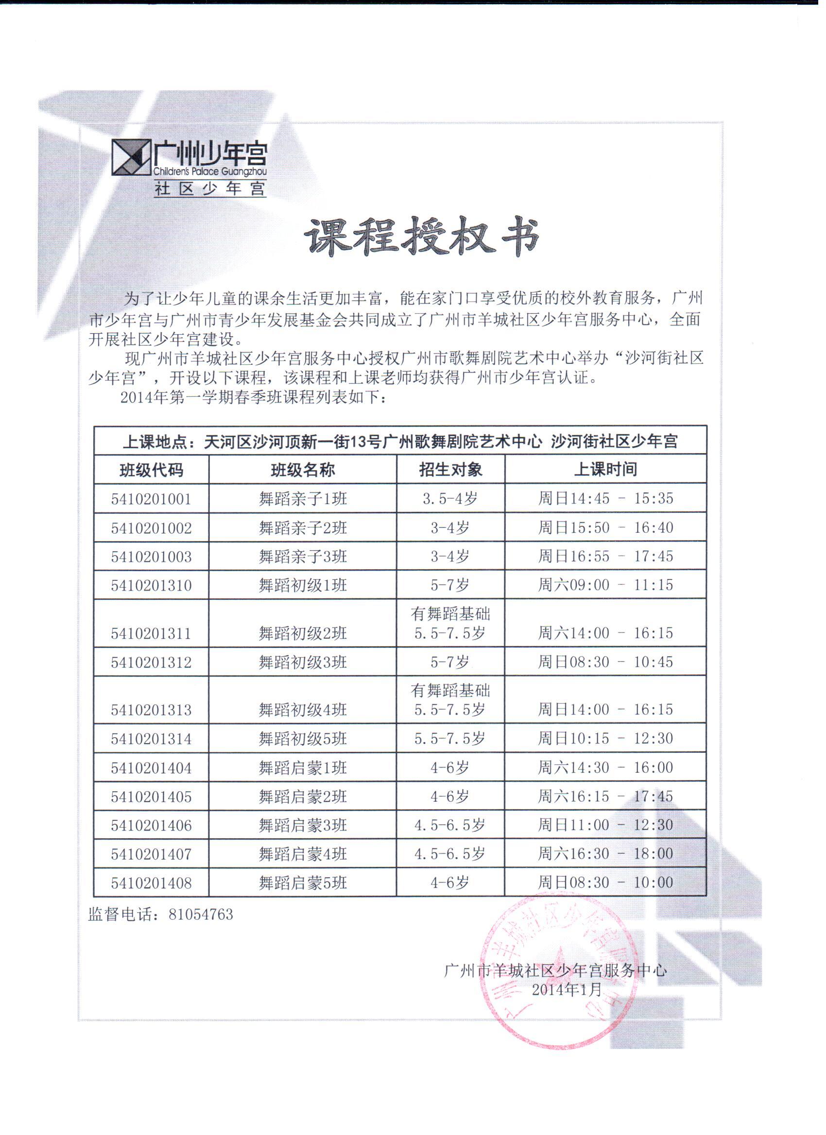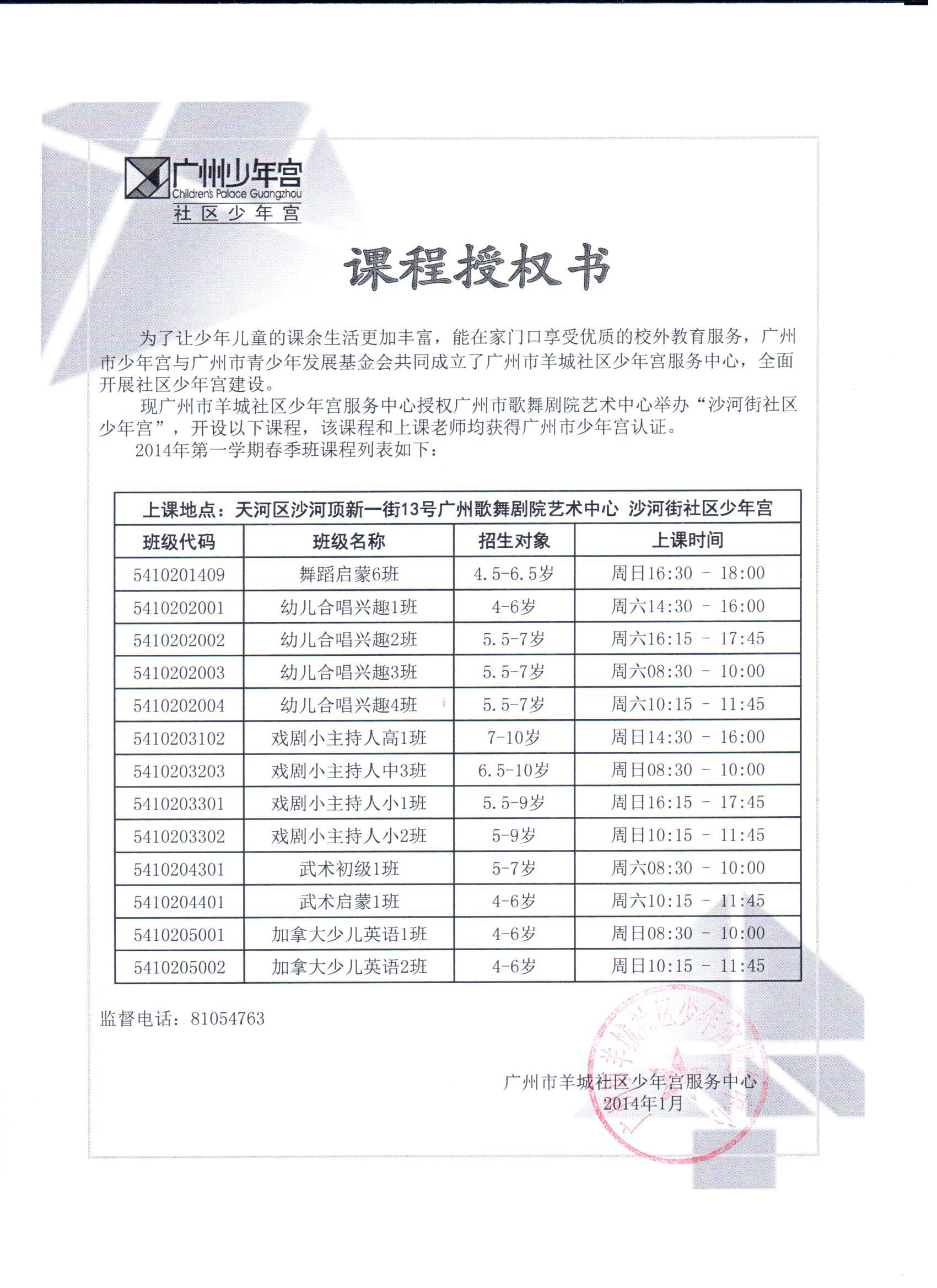 2014年沙河街社区少年宫课程授权书