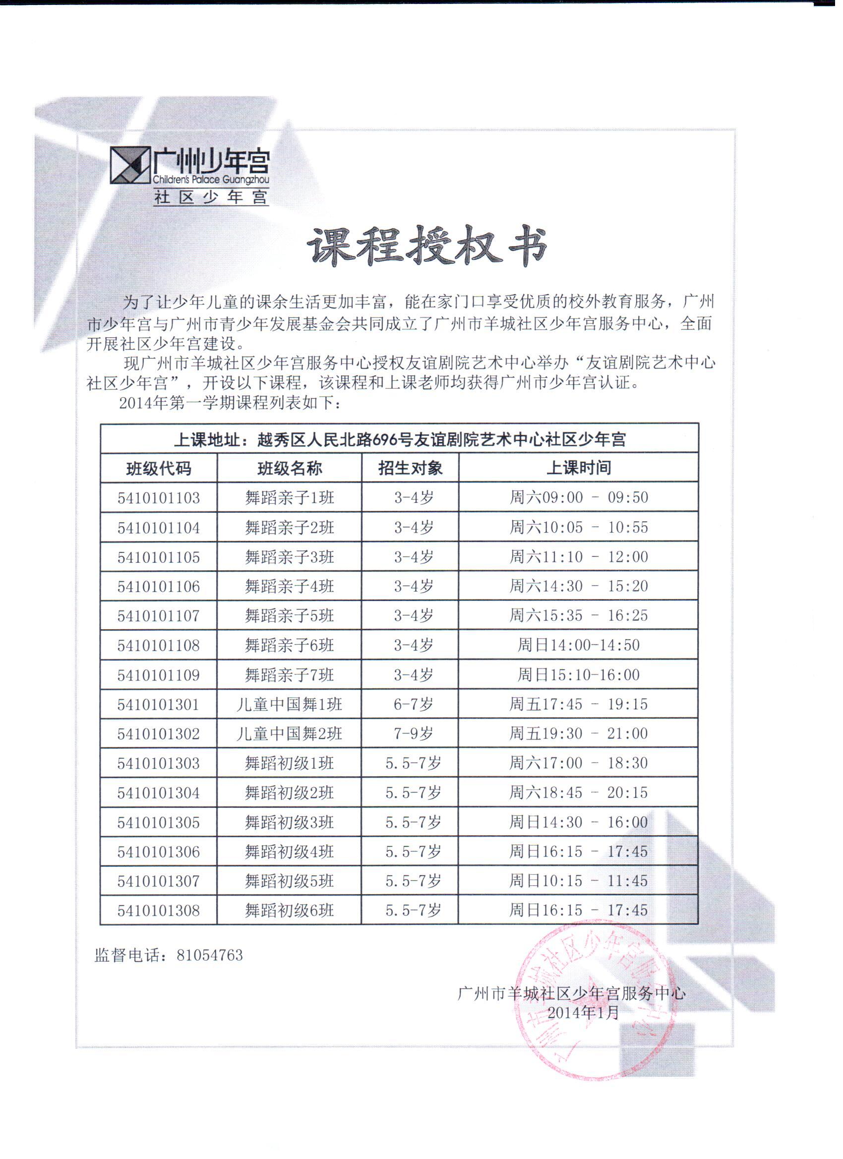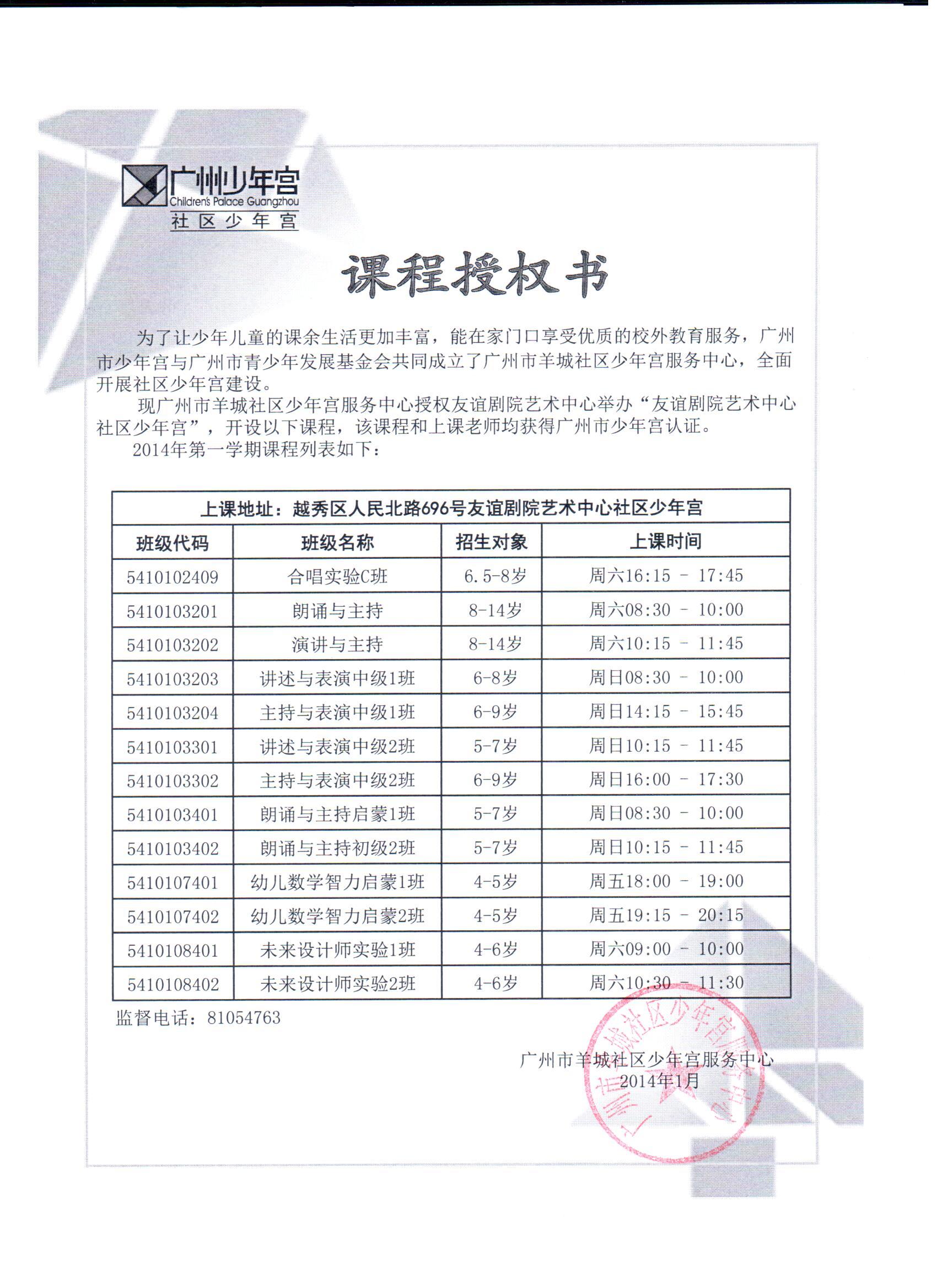 2014年友谊剧院艺术中心社区少年宫课程授权书
