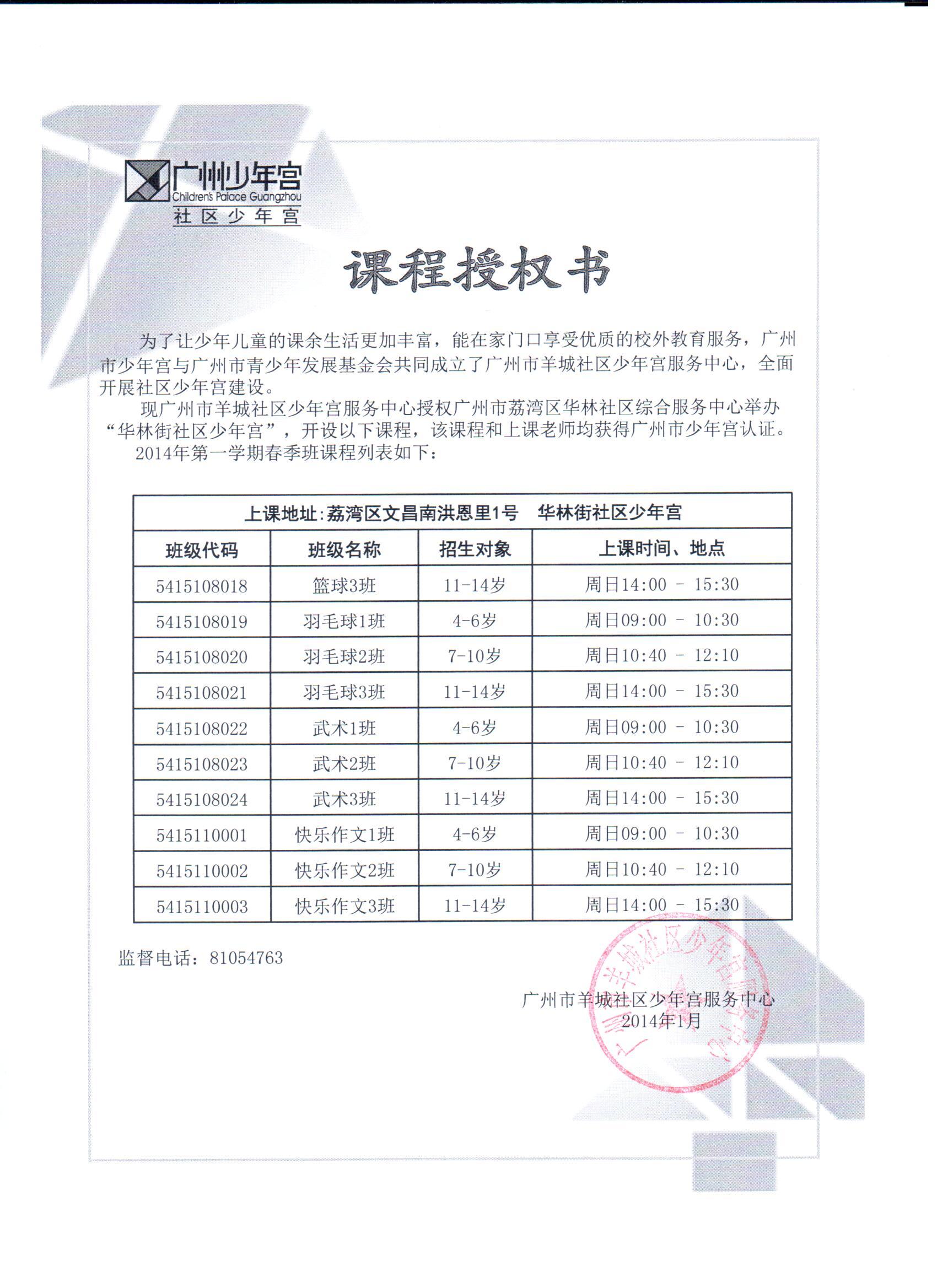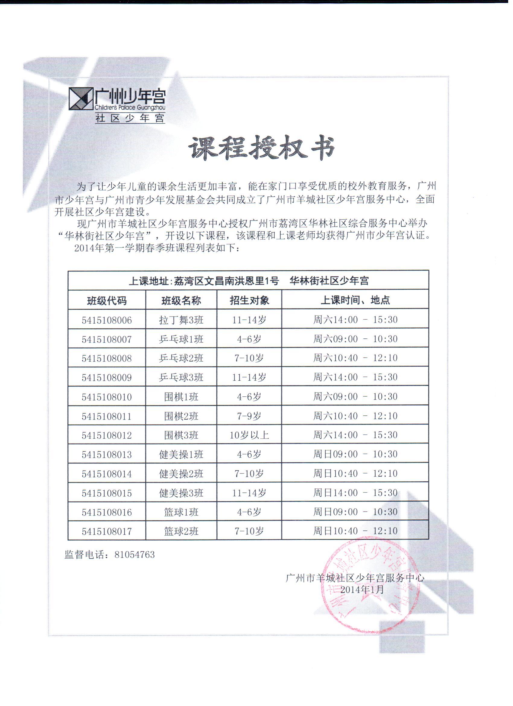 2014年华林街社区少年宫课程授权书